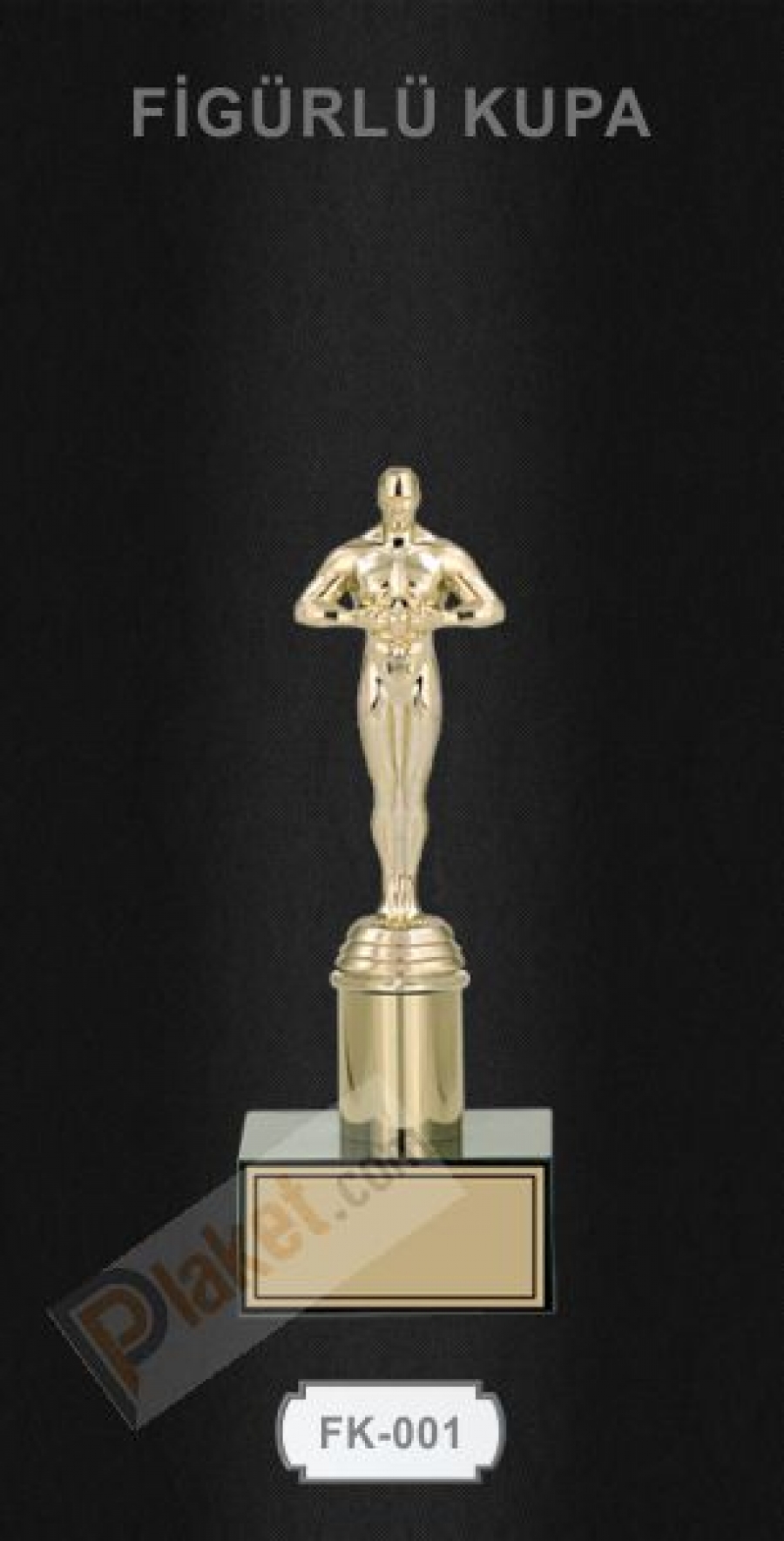 Figürlü Kupa FK-001 Siyah Kaide üzerinde altın nikel kaplama figürlerin olduğu özel kupalardır. 3 boy figürlü kupayı birincilik kupası, ikincilik kupası ve 3.lük kupası olarak kullanabilirsiniz. Resimde görülen oskar figürü yerine (furbol, basketbol, satranç vs.) figürlerden de isteyebilirsiniz. Alt kaideye de turnuva veya yarışmanızla alakalı yazı logo vs. yazdırabilirsiniz.